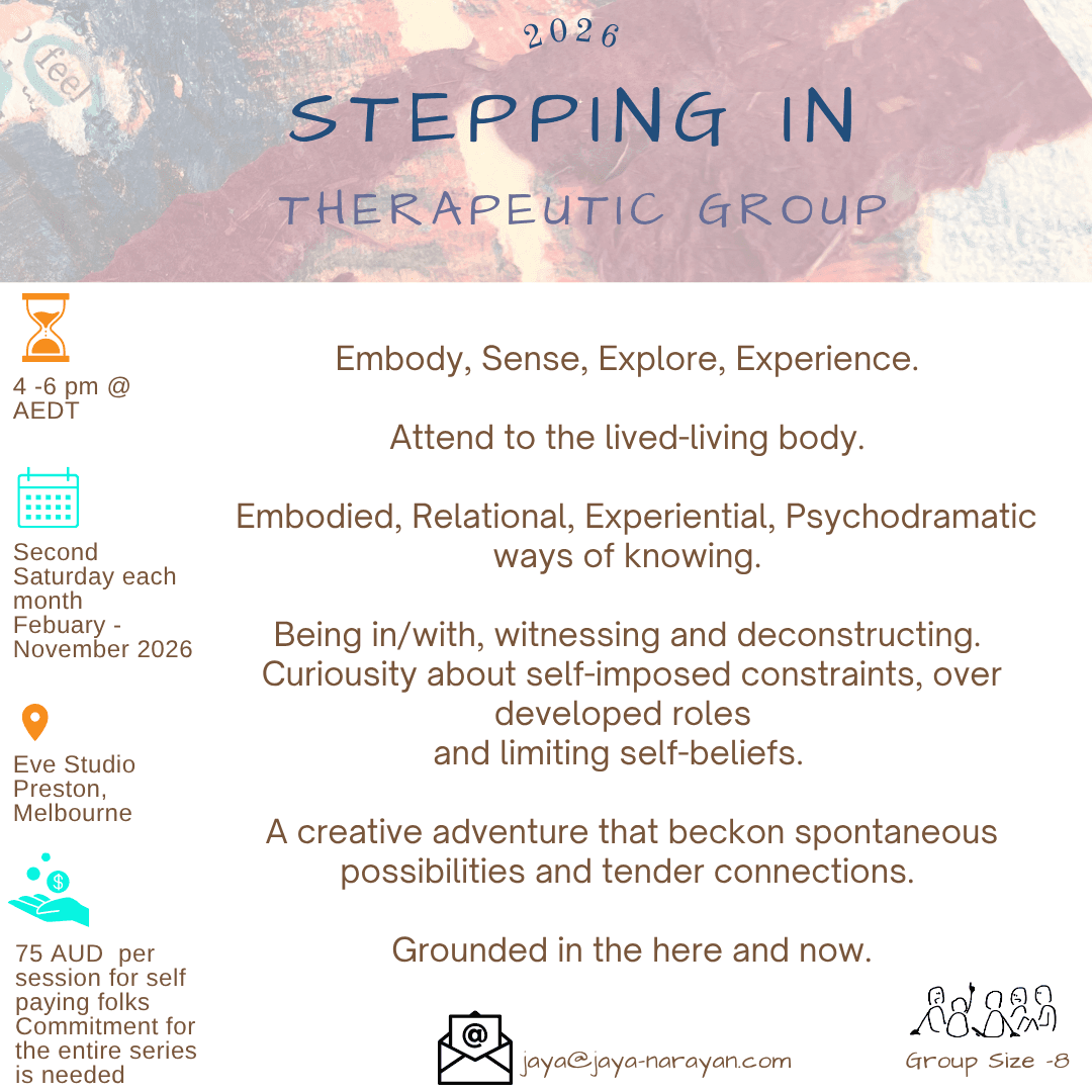In offering the therapeutic groups, I interweave Expressive art(s), Psychodrama, Relational somatics, movement modalities, and Process work to foster self-awareness and interpersonal and collective knowing.