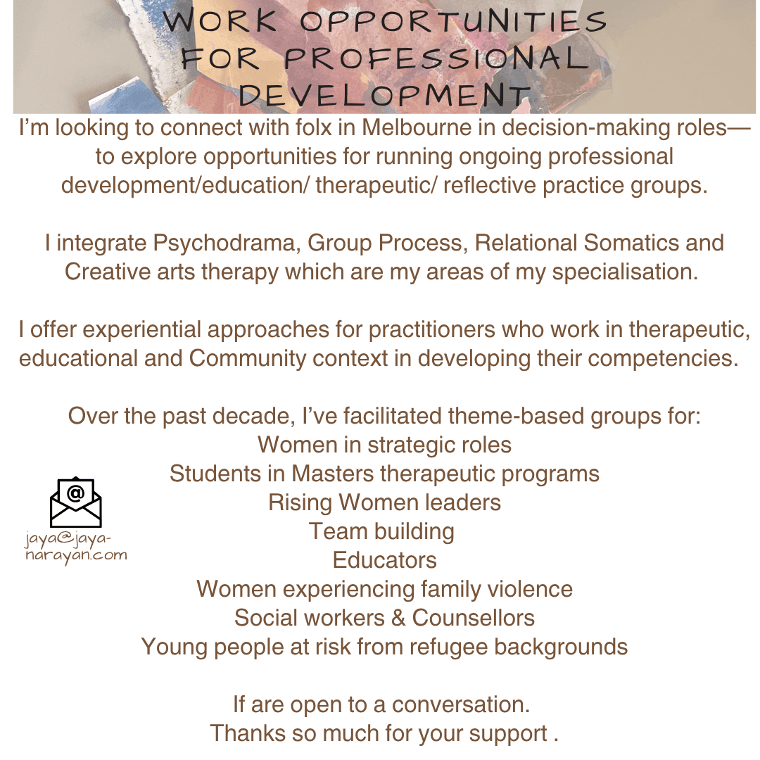 In 2026, I am offering spaces and structures that can hold the unfolding relational processes. You can hear/see a detailed video on my YouTube channel. There is an expression of interest form on my website for anyone who is part of a communal effort to be with/ alongside, and supportive of one another.